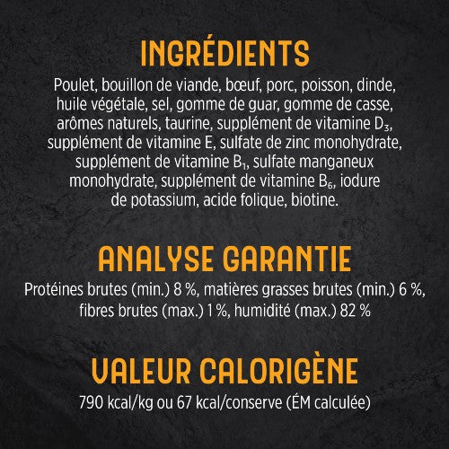 Poulet, bouillon de viande, bœuf, porc, poisson, dinde, huile végétale, sel, gomme de guar, gomme de casse, arômes naturels, taurine, supplément de vitamine D3, supplément de vitamine E, sulfate de zinc monohydrate, supplément de vitamine B1, sulfate manganeux monohydrate, supplément de vitamine B6, iodure de potassium, acide folique, biotine.