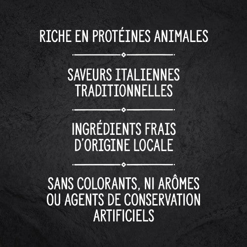 Faites avec amour et des ingrédients locaux de qualité, nos recettes haut de gamme contiennent une remarquable teneur à 95 % en viande fraîche et en poisson frais. Réjouissez-vous des saveurs riches de l’Italie avec des ingrédients de sources locales soigneusement choisies afin de reproduire un authentique repas italien.