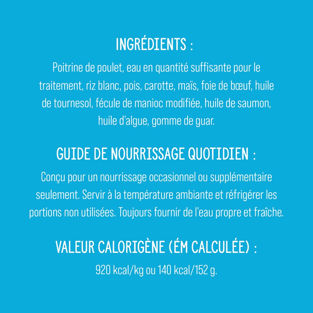 Ce produit est conçu pour un nourrissage occasionnel ou supplémentaire seulement. Servir à la température ambiante et réfrigérer les portions non utilisées. Toujours fournir de l’eau propre et fraîche.